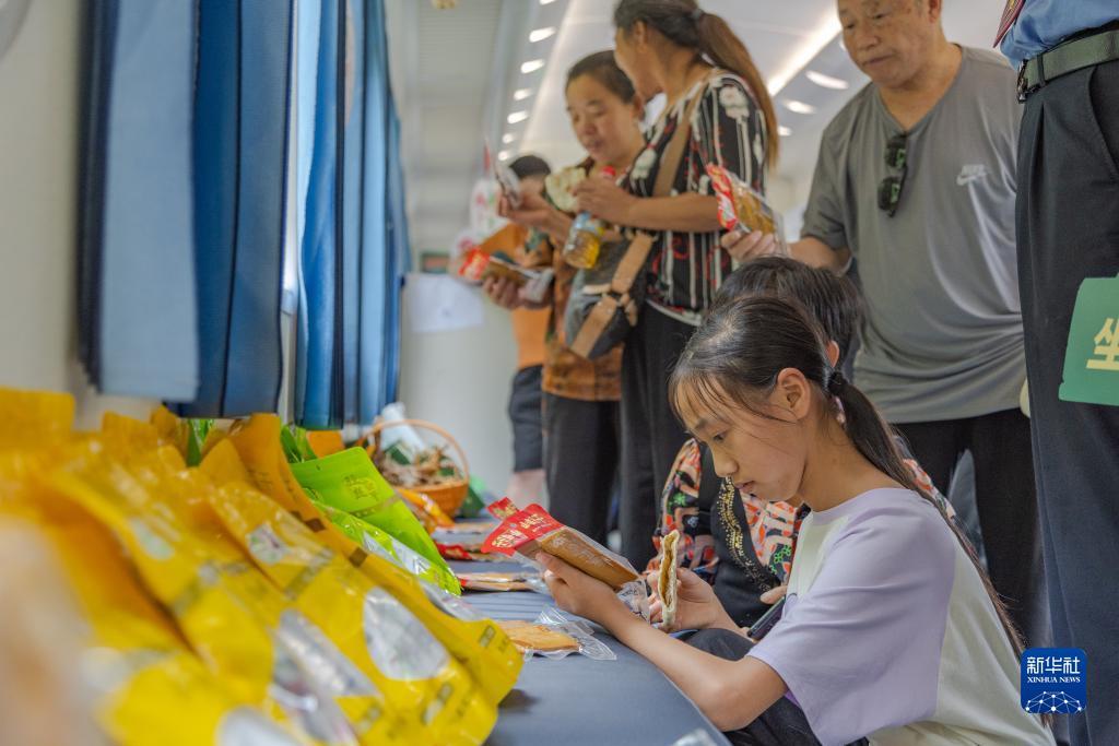 7月11日,搭客在5630次列車上的“列車集市”選購土場地佈置特產。